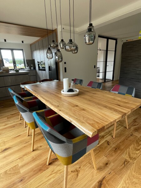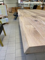 40 x 2600 x 1000 mm Tischplatte / Leimholzplatte Eiche m. echter Baumkante unbearbeitet, offene Stellen schwarz gespachtelt, durchgehende Lamellen bis 150 mm Breite fallend, ohne Tischgestell, geölt (OSMO Hartwachs Öl Effekt Natural)